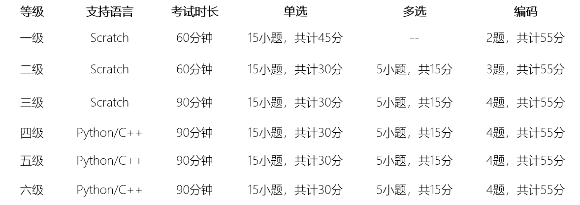 YCL青少年人工智能编程水平测试 题型、分值分布