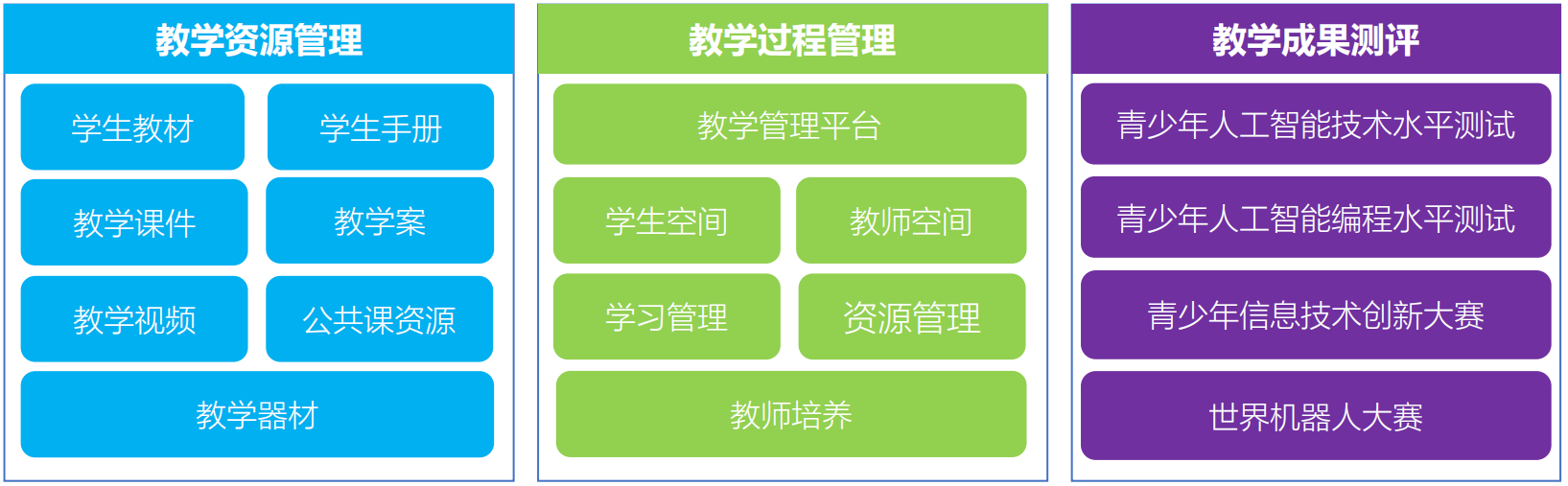 方案立足于新时代下的中小学学情,基于学生信息技术培养的视角,扎根科学实践,以培养学生科技素养、锻炼逻辑思维为目的,建立了科学严谨的教学体系,方案分为“教学资源”“教学过程”和“教学成果测评”三大部分,为学校提供专业化与优质化的服务。同时,在权威的行业体系和优质课程资源的引领下,方案能够针对各年龄和能力阶段的学生配备不同的教学器材、专业高效的教学平台助力师生的教与学,此外,还提供了规范的测评服务与比赛平台展示学习成果等。