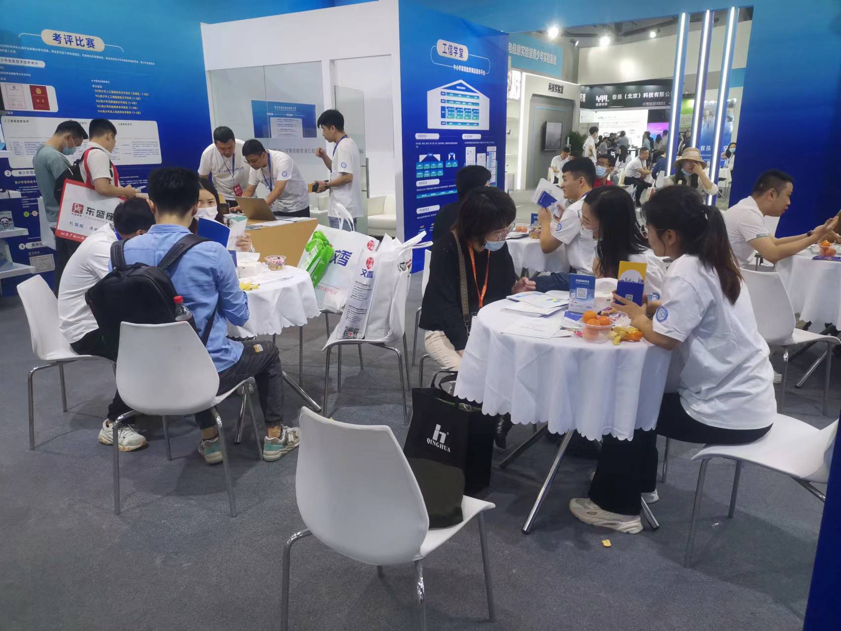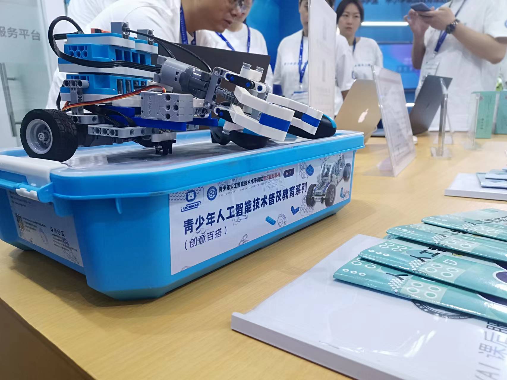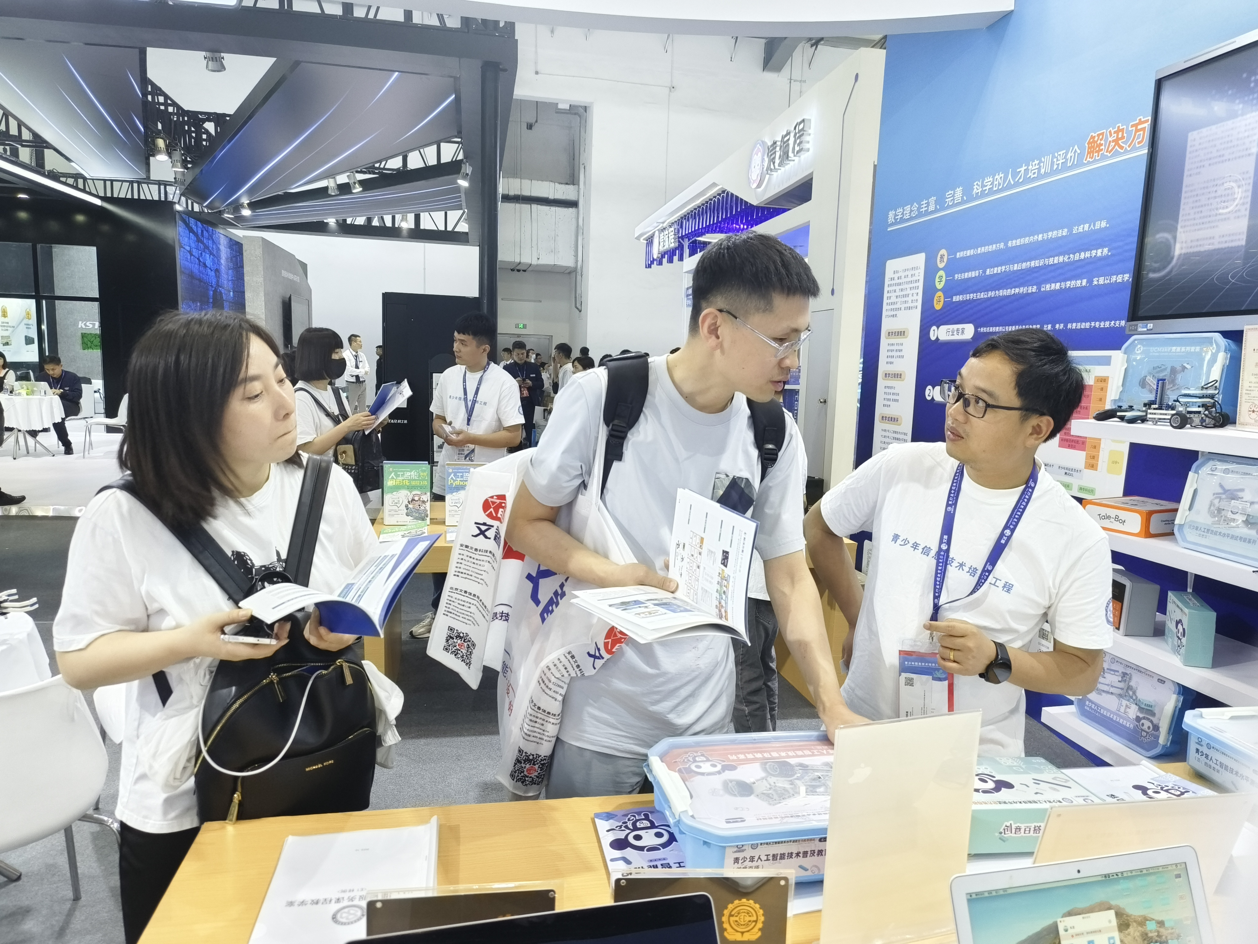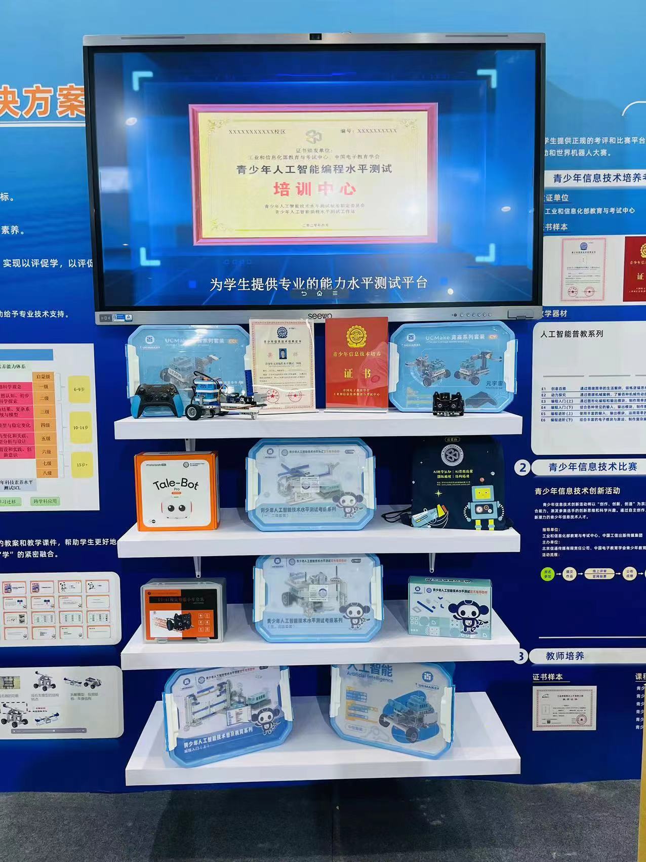 青少年信息技术培养工作站带来青少年人工智能等级测评、“工信学堂”中小学素质教育课后服务平台、青少年信息技术创新活动、世界机器人大赛——YAI赛项等项目及相关教材、器材、证书等参展。